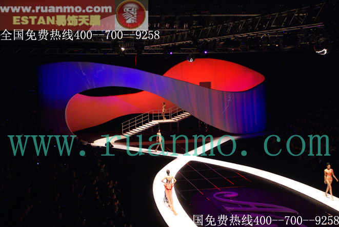 舞臺(tái)首次采用ETFE膜結(jié)構(gòu)材料(易飾天公司制作),也就是水立方外墻的材料,不僅環(huán)保,抗壓性好,而且其呈現(xiàn)出的透明效果更佳凸顯出現(xiàn)代藝術(shù)的氣息。而且,更令人感到新奇的是,這次的模特線路改變了以往的直線,而是一條曲線的走道。張艦表示:“這是為了配合主題,曲線形路線與T臺(tái)上模特的曲線身材遙相呼應(yīng)。”